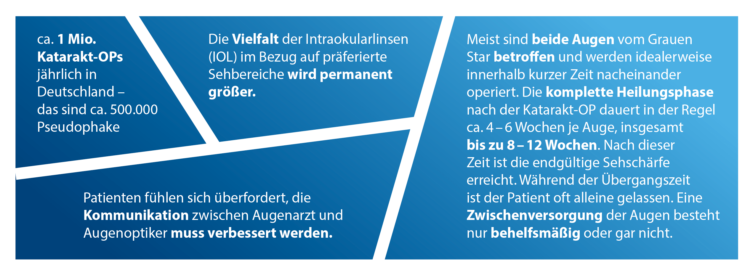 Unter einer ganzheitlichen Katarakt-Betreuung verstehen wir eine bestmögliche augenoptische Versorgung während der kompletten OP-Phase bis hin zur endgültigen Brille. Die Beratung sollte bereits mit einer Entscheidungshilfe zur Wahl der Intraokularlinse (IOL) beginnen, die das Vorgespräch des Patienten mit dem Augenarzt oder Refraktivmanager erheblich erleichtert.