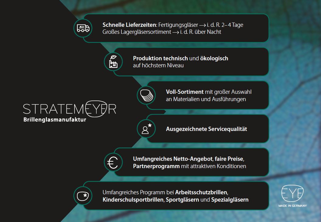 - Heute: In der Manufaktur werden hochwertige Brillengläser mit Freiformtechnologie gefertigt. Dabei wird großen Wert auf die nachhaltige Herstellung von Brillengläsern gelegt. Stratemeyer ist ein Vollsortiment-Anbieter und gleichzeitig ein Gleitsichtglasspezialist. Wie groß die Bedürfnisse Ihrer Kunden und wie hoch Ihre Ansprüche auch sind – wir bieten Ihnen genau das Glas, das das Leben am besten einfängt. Unser breites Sortiment beinhaltet eine große Auswahl an Materialien und Ausführungen von Einstärken-, Gleitsicht-, Nahbereichs- und Spezialgläsern. Komplettangebote im Bereich Arbeitsschutzbrillen, Sportbrillen, Sonnen- und Officebrillen sowie Kinderschulsportbrillen runden unser attraktives Brillenglasprogramm ab.
